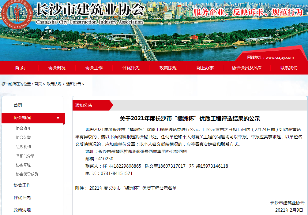 近日,长沙市建筑行业协会公示了2021年度长沙市“橘洲杯”优质工程评选结果,集团子公司湖南警安工程有限公司承接的“长沙市啤酒厂宿舍棚改项目消防工程”被评为2021年度长沙市“橘洲杯”优质工程。